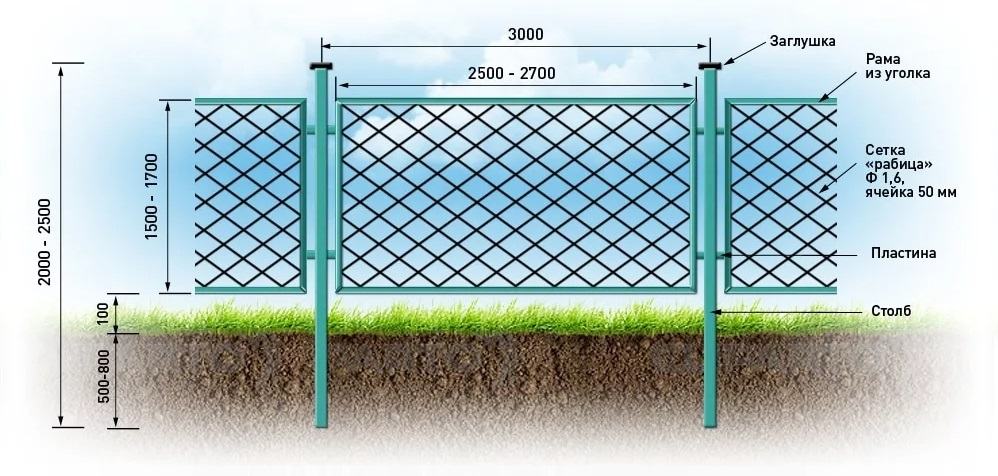 Конструкция забора из сетки-рабицы с протяжкой арматурой